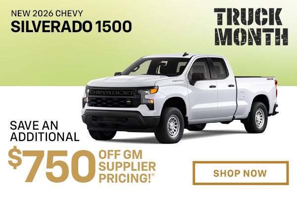 *Save an additional $750 off GM Supplier Pricing on New 2026 Chevy Silverado 1500 trucks. Example: STOCK# C50860, MSRP $53,495 less $5,953 savings (includes $2,500 Customer Cash from GM, $2,703 Supplier Discount for Everyone from GM, and $750 additional savings from Balise) = $47,542 before taxes and fees. Selling Price $48,326 including $784 doc & title prep fees. Everyone qualifies for Balise savings. Sales tax, title, license/reg fees additional. All incentives to dealer, may not be combined with other offers. Take delivery by 3/31/2026.