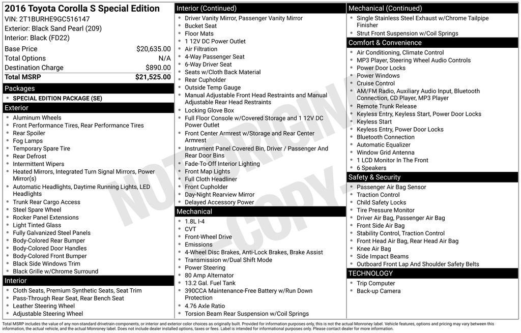 With its impressive list of features, exceptional fuel efficiency, and stylish design, the 2016 Toyota Corolla S Special Edition is a must-see for any discerning car buyer. Experience the difference for yourself and schedule a test drive today. We're confident you'll be impressed by the quality, performance, and value this Corolla has to offer.